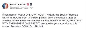 Donald Trump has issued a stark warning to Iran, saying the United States will “obliterate” the country’s power plants within 48 hours if Tehran does not reopen the Strait of Hormuz.